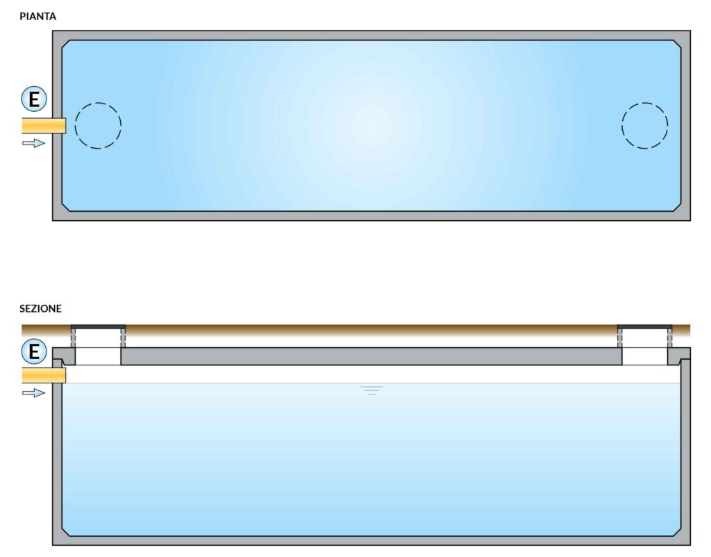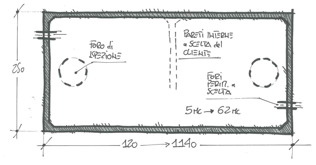 Vasca in calcestruzzo armato vibrato, monoblocco, parallelepipeda, a perfetta tenuta idraulica. Capacità geometrica fino a 62 mc per singolo manufatto. Possibilità di realizzare volumi di accumulo maggiori affiancando tra di loro le vasche e prevedendo appositi collegamenti idraulici in prossimità del fondo.